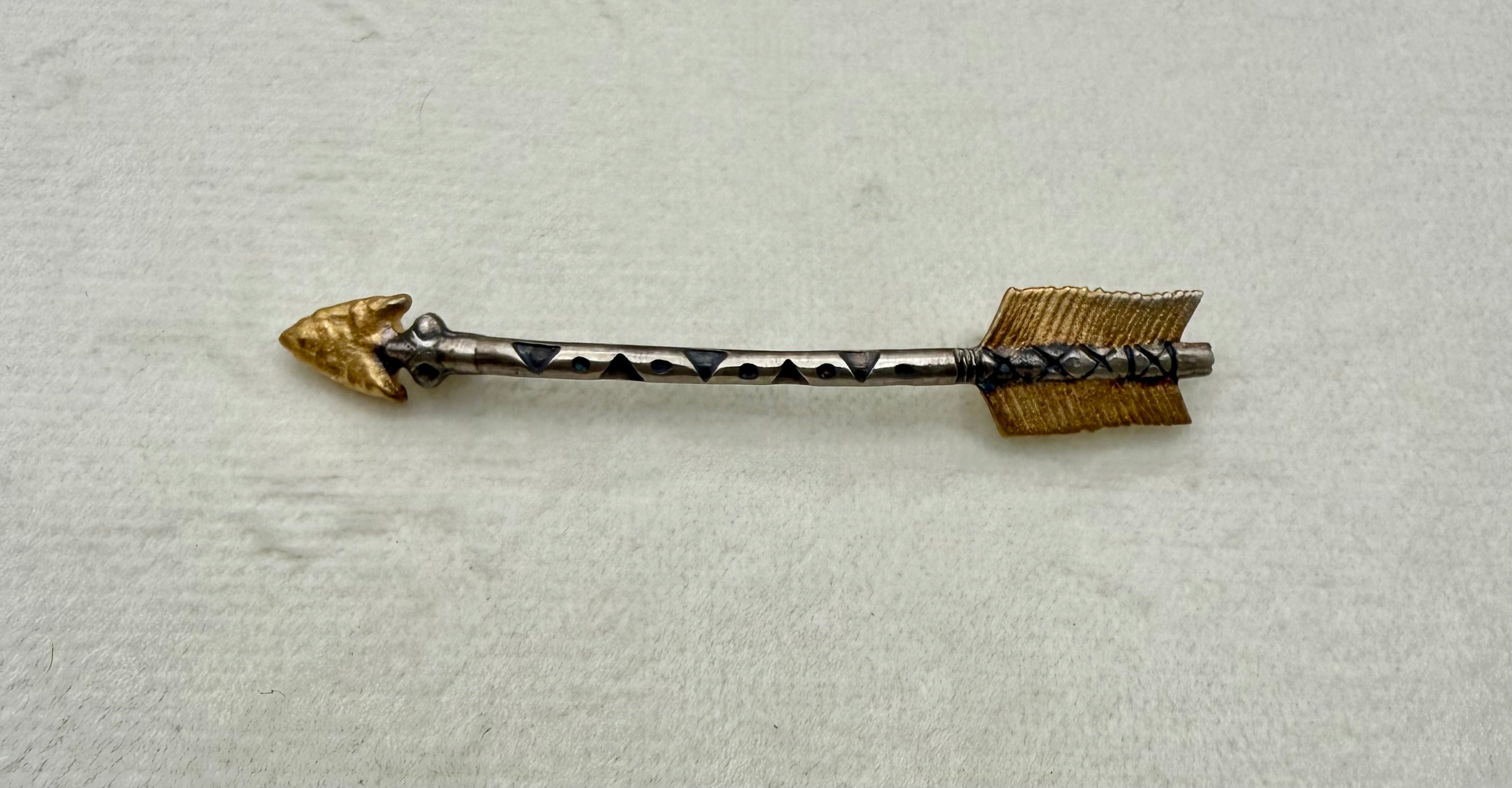 This is a stunning arrow hat pin. The materials are a soft matte sterling silver and gold as shown on our The Betty hat.